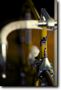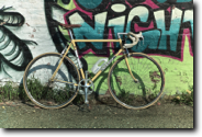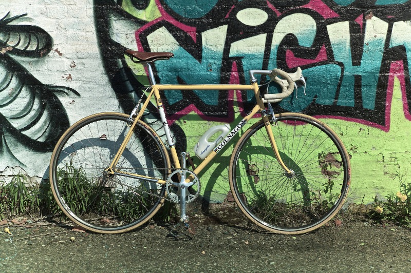 This singlespeed is made of Columbus tubes with wonderful luggs all made by Somec in the 1970's. The bike is labelled with COLNAGO stickers for the optic. | ||