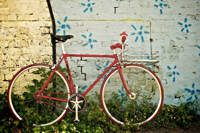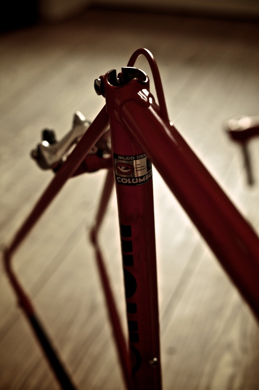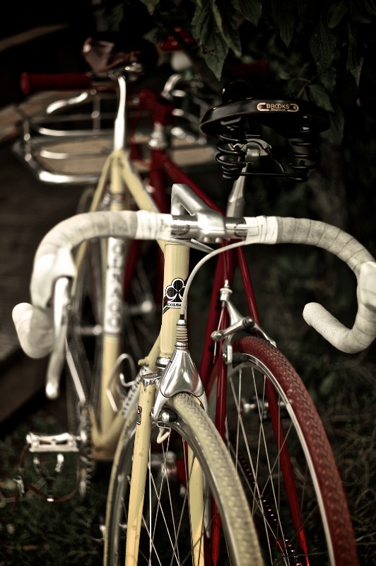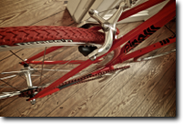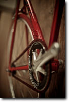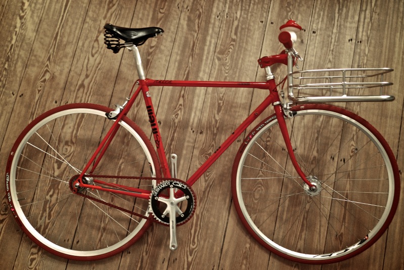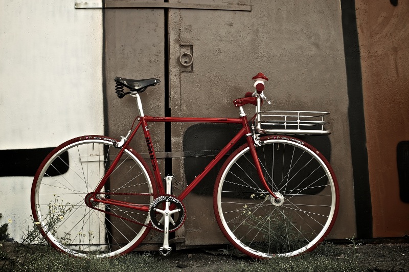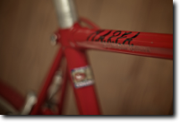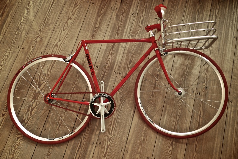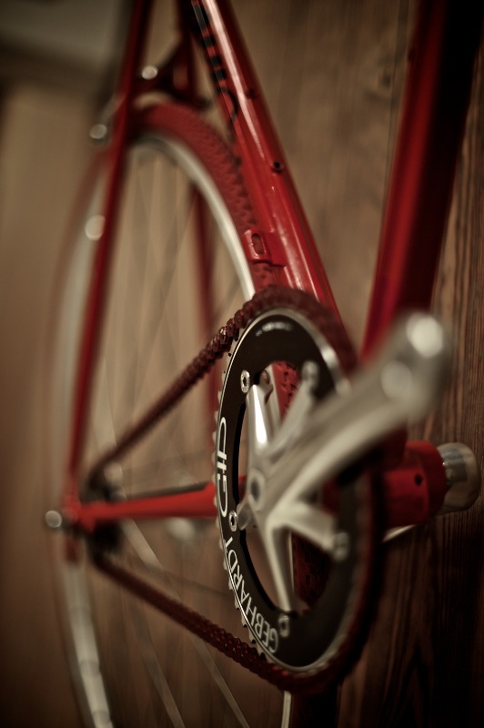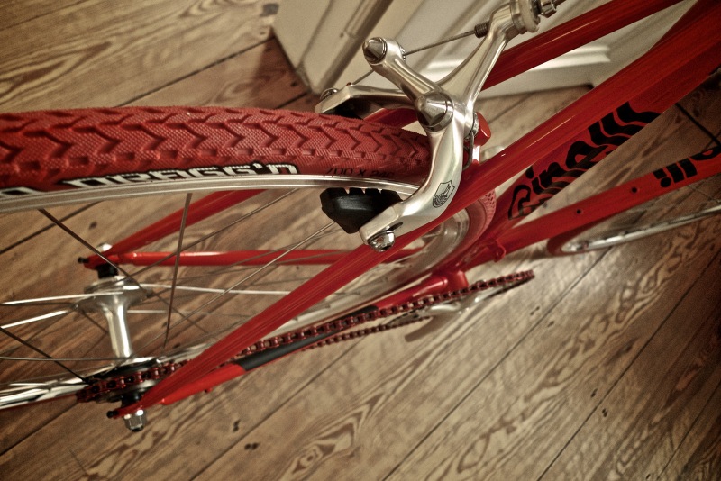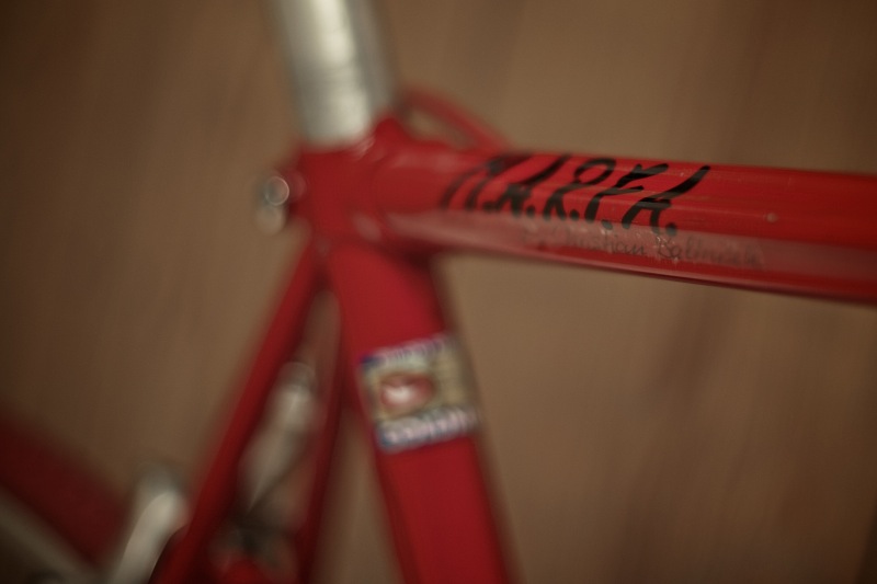 M.A.R.F.A. Technical specification: Frame: Cinelli Columbus Gilco Tubes Wheels: Rigida Rims with Miche XPRESS FlipFlop Hubs (Aixle aft 130 mm) Sprockets: Shimano freewheel 16 teeth and Miche Pista sprocket with 16 teeth Tires: Fixie Pops Red Crankset: Campagnolo Chorus rebuilt to singlespeed with spacers and 47 teeth Pedals: no name Bottom bracket: Campagnolo Chorus Italian thread Brakes: Campagnolo Athena 80's Brake levers: Cross levers Stem: 3TTT Mutant red Headset: Campagnolo C-Record 1" Bar: Kopenhagen Parts Saddle: Brooks Woman Classic Seatpost: Kalloy Aero Classic Bottle&cage: none | ||